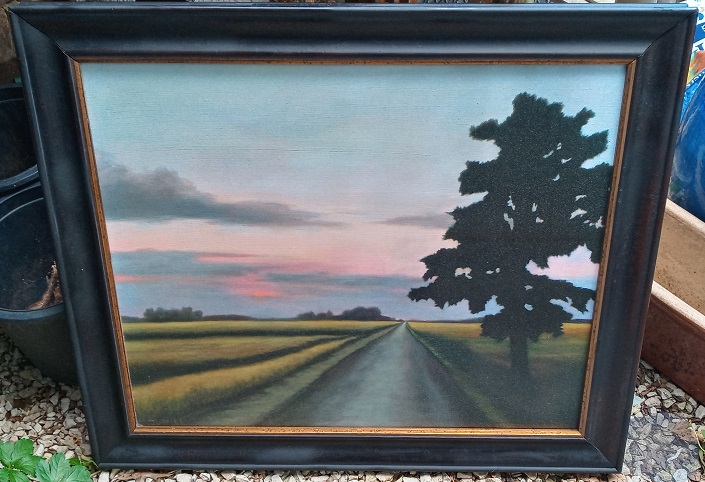 This is a large landscape by Georgia artist Bill Turner. This also sat in the same thrift store for over a week. It had a pretty good dent in the canvas that I was able to shrink right back out. I had to touch up the frame from numerous scrapes and chips. I also think that some probably thought this a print or factory art. It is exactly what the artist does, with thin application of paint (maybe airbrush?). Bought for $4.00 with my Senior Day discount. :cool: