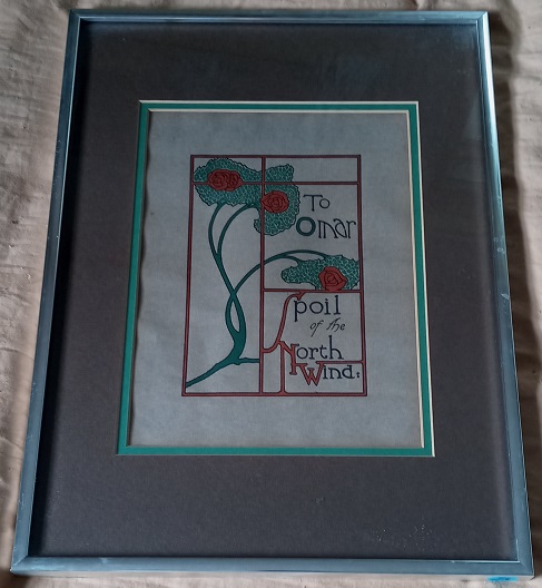 This is a nice framed art nouveau book cover. Framed fairly recently but this old label was attached to the back. Bought for $2.00.