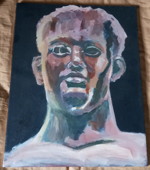 This medium sized acrylic on canvas is signed only "Rosanne". Probably student work. Have had this in my room for awhile now and it is growing on me. Maybe Raphael Soyer meets Frankenstein?.... :woot:
