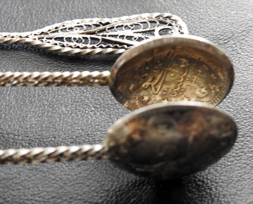 Featured Turkish filigree silver and coin demi-tasse spoons and tongs set