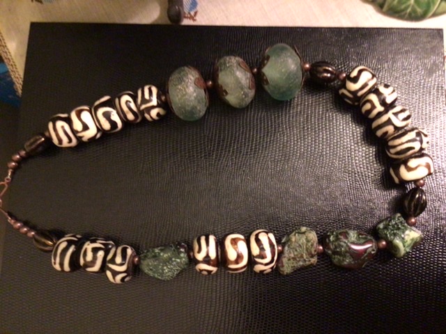 The dark beads with the creamy white motifs look like Asian etched agate beads, but they could be imitation. I have seen similar beads as imitations made by Tibetan nuns in exile in India.