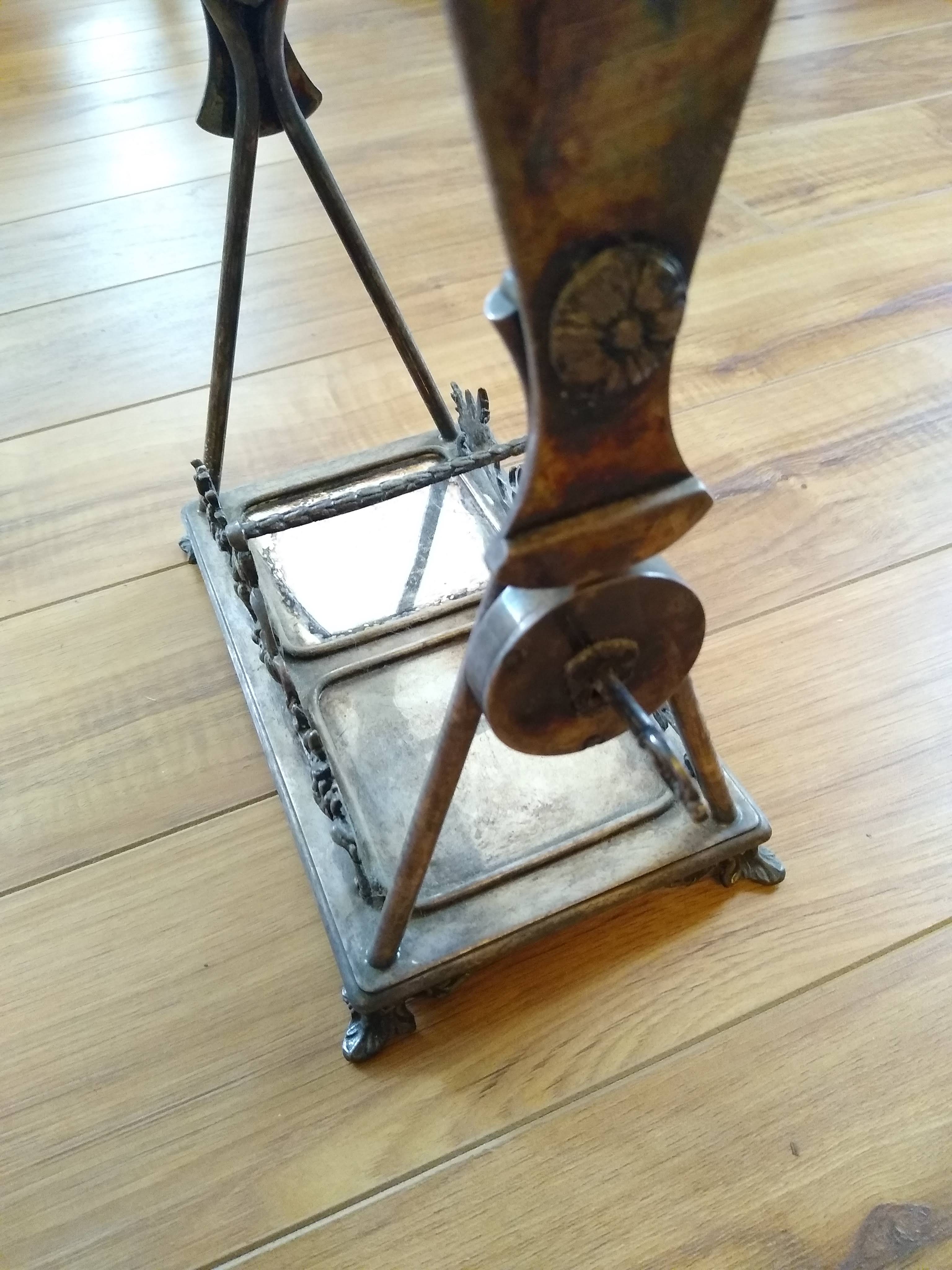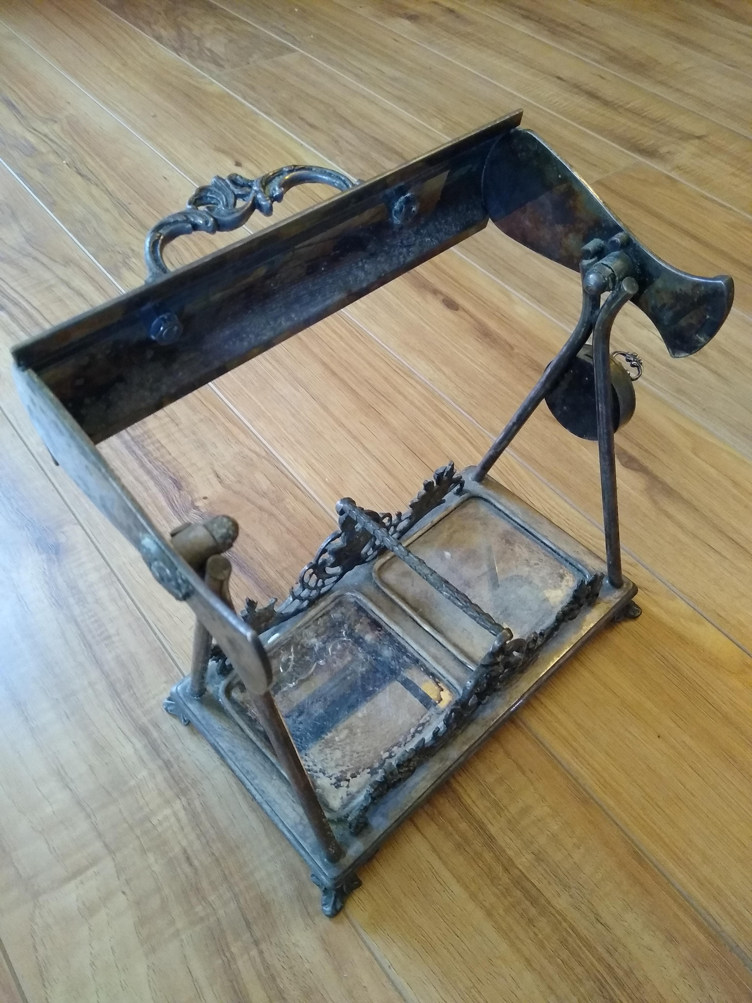 I recently acquired this piece and would appreciate some help identifying what it is. To me it looks like some type of serving plate maybe for cream and sugar or maybe a candle holder. It has a lock built in which locks the movable top in an upright position. There are some markings on the bottom edge which say "made Italy" and either a mark or some other symbol as seen in the photos. I can't find any other markings anywhere. Looks silver plated to me.
