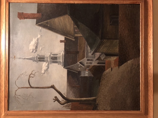 Look what I found for you! The setting of your painting. United Church of Christ, Derby, Connecticut where, according to the 1940 census, the artist lived with his parents. Their address was 159 Derby Avenue and the church is at 137 Derby Avenue so may very well have been a scene painted from his bedroom window. Googe Maps and Zillow will orient you. Debora