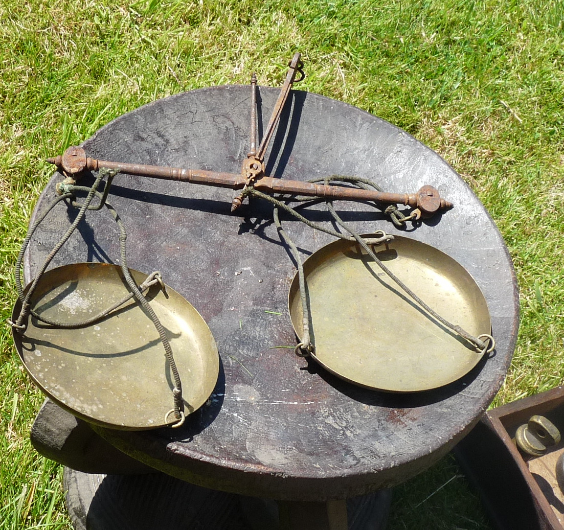 but the thing I was most pleased to see was a complete set of nested cup weights, because I have have seen many with a weight or two missing, most often the tiny one in the middle, and looking at ebay it is infested with modern Indian repro stuff being touted as antique/vintage. Not all that valuable, but I like them. Maker possibly from a tiny monogram, TR.