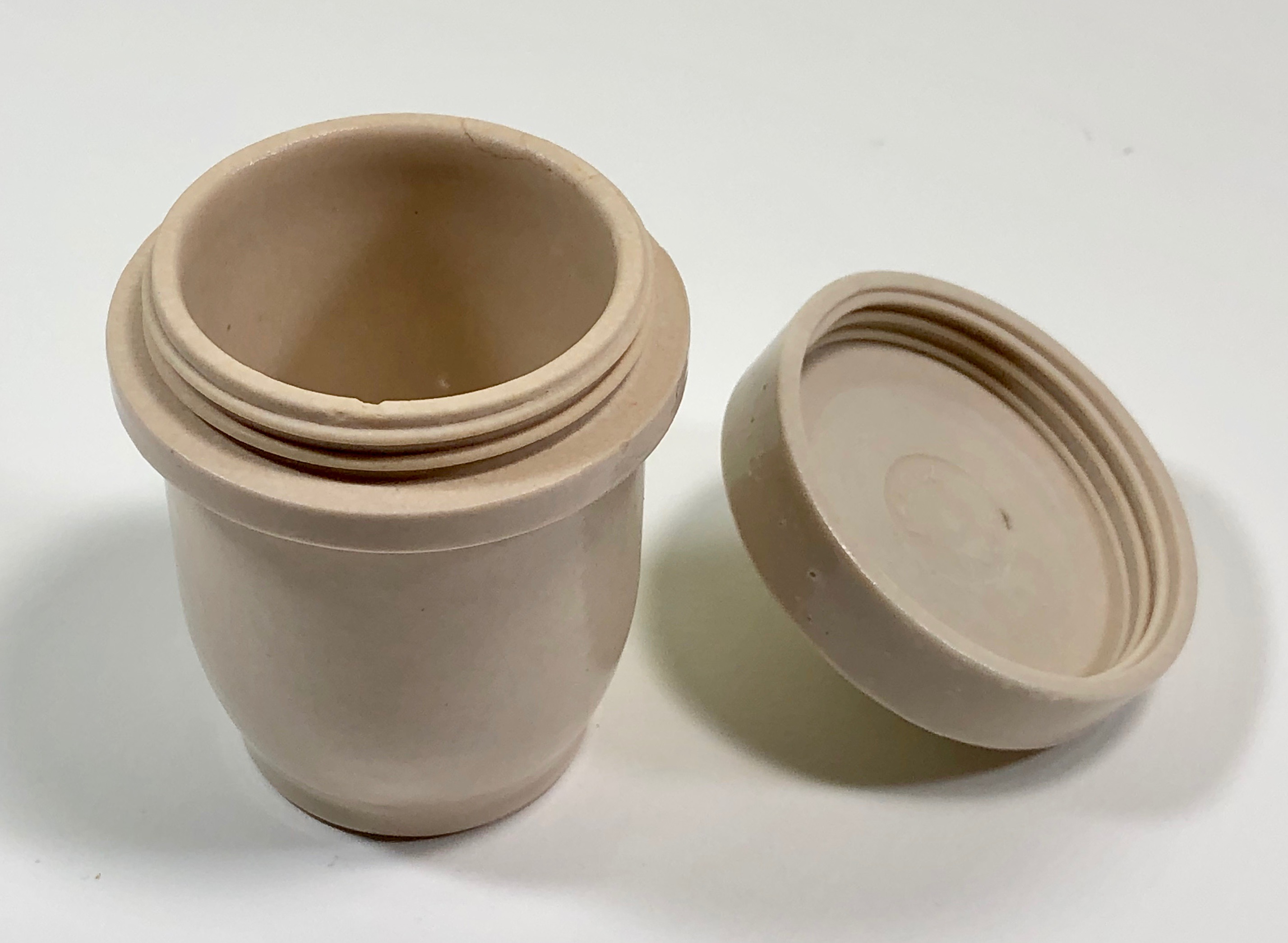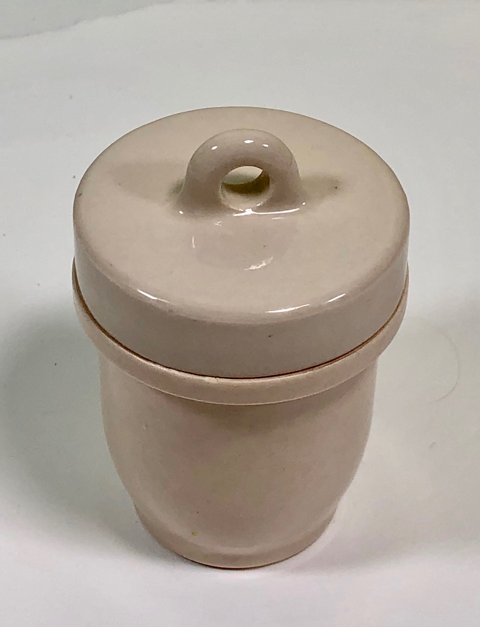 I assume that the mother-in-law brought it back from one of her trips, , , ,. 3 1/2 inches tall and the top is aprox 2 1/4 inches in diameter. Glazed ceramic.