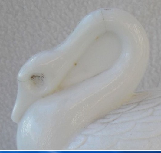 So far I have noticed ONE chip on the short side of the base. And, of course, the poor swan is blind. But that can be cured very quickly. Eyes on this type collectible are insignificant. Most likely because they are so often missing and regularly replaced with no affect on value. Popping in the dishwasher is NOT recommended for any type of opaque glass and is usually the culprit in eating eyes.